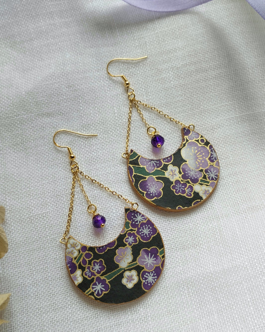 Orecchini di carta pendenti in carta giapponese chiyogami viola e nera con fiori di ciliegio - sakura - modello INDIRA