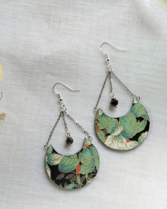 Orecchini di carta pendenti in carta giapponese chiyogami verde -nero - argento - modello INDIRA